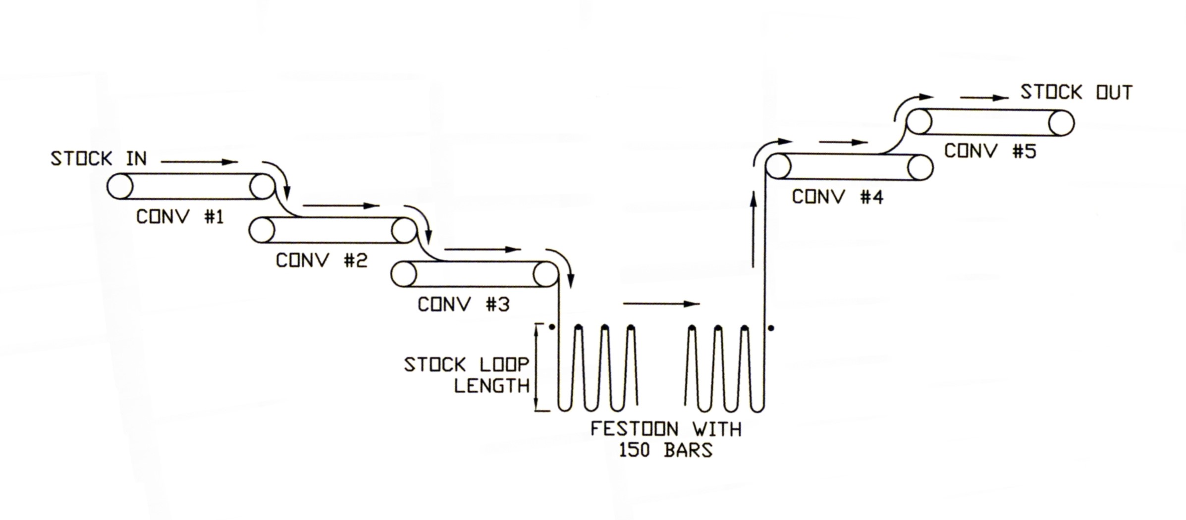 Another pleasant challenge was programming the PLC to calculate and remember the length of each stock loop formed by CONV #3 and the festoon, then have that length enter the calculation of the speed set point of CONV #4 when that loop arrives at CONV #4.